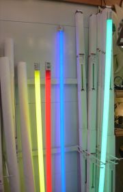 Dziś jest trudno znaleźć prawdziwą lampę neonową, świecącą na czerwono - tak zwane "neonówki" zawierają argon i rtęć (i świecą na biało) lub argon i sód (i świecą na żółto). Podobnie jak "prawdziwy" ekran fluoryzujący na zielono, pokryty siarczkiem cynku, można znaleźć tylko w starych oscyloskopach lub czarno-białych telewizorach. |
