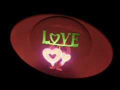 Po podłączeniu do sieci żarówka świeci - serduszka na czerwono a napis "love" na zielono. A właściwie nie serduszka świecą, ale czerwonawa mgiełka wokół nich. |