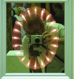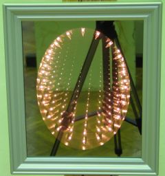 Spoglądając w to "okno" widzimy długi tunel z lampami. W rzeczywistości jest to płytka skrzynka z dwoma lustrami: całkowicie odbijającym na dnie skrzynki i częściowo odbijającym, na przedniej ściance, zaś za przednią szybą znajduje się sznur lampek. Obraz tych lampek odbija się w lustrze na dnie skrzynki a obraz tego obrazu od przedniej szyby, tworząc, po ponownym odbiciu od dna kolejne wrażenie rzędu lampek, itd. |