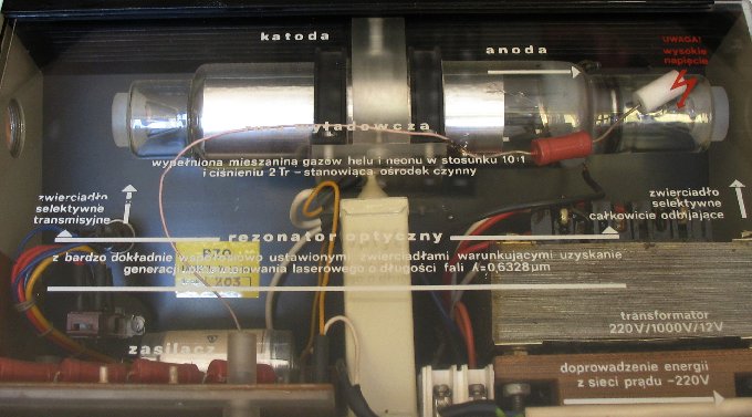 Na podobnej zasadzie działają lasery: ośrodek emitujący światło (gaz, kryształ) znajduje się między dwoma lustrami "półprzepuszczalnymi" (w rzeczywistości odbijają one 99% światła i więcej). Światło odbijając się, przechodzi wielokrotnie przez materiał emitujący, oddziałuje z jego atomami (lub drobinami, jak w laserze CO2) i ulega "wzmocnieniu" (sumuje się z promieniowaniem wymuszonym). Jedna z zasad leżąca u podstaw działania lasera jest więc podobna jak w naszym tunelu - wydłużenia drogi optycznej. |