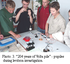 "204 years of Volta's pile" reconstructs history of discoveries and principles of work of electricity sources, which beginning at Volta coins pile and ends at liquid hydrogen "fuel" pile. It is a proposition for secondary school teachers how in non expensive and easy way enrich school laboratory with new demonstrations illustrating electrostatics phenomena, work principles of galvanic and photovoltaic piles. During the Congress an about 4000 people have visited exhibitions. |