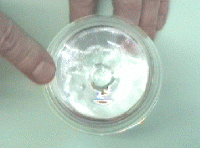 Fot. 3. W kieliszku wypełnionym wodą, po wzbudzeniu częstotliwości rezonansowej, pojawiają się najpierw fale wędrujące za palcem po powierzchni wody, przy większej amplitudzie woda zaczyna "wrzeć" w 4 wierzchołkach kwadratu. |