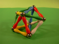 Magnesy, jak to już pisaliśmy w kilku miejscach, mają zawsze dwa bieguny. Podobnie te patyczki: na ich końcach znajdują się przeciwstawne bieguny. Może się więc zdarzyć, że trzy patyczki, które chcemy połączyć mają te same bieguny. Nie ma na nie sposobu: odpychają się wzajemnie. No chyba, że między tymi takimi samymi biegunami znajdzie się żelazna kulka. Wówczas wszystko daje się zgrabnie połączyć.