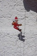 Pracowity Mikołaj wspina się po linie do komina. A w zasadzie to jego pomocnik pociąga tylko z dołu silnie za linę, a Mikołaj wędruje w górę bez własnego wkładu pracy.