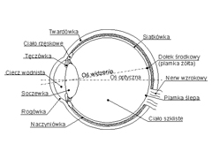 Światło wpadające do oka biegnie przez rogówkę, komorę przednią oka, soczewkę i ciało szkliste, by zakończyć swą podróż na siatkówce wywołując wrażenie wzrokowe przekazywane do mózgu za pośrednictwem nerwów łączących się w nerw wzrokowy. Rogówka, wraz z cieczą wodnistą, soczewką i ciałem szklistym, stanowią układ skupiający promienie świetlne tak, by na siatkówce pojawiał się ostry obraz obserwowanego przedmiotu i dawał jak najostrzejsze wrażenie wzrokowe. Dlatego też soczewka ma możliwość zmiany swojego kształtu, a co za tym idzie mocy optycznej. Pozwala to na ogniskowanie na siatkówce przedmiotów znajdujących się w różnych odległościach od oka. Zdolność tę nazywamy akomodacją. Ostre widzenie uzyskiwane jest wtedy, gdy ognisko obrazowe pokrywa się z siatkówką. W przypadku, gdy oko nie jest w stanie zogniskować światła dokładnie na siatkówce mówimy o wadach wzroku. Moc optyczna oka nieakomodującego wynosi około +60 dioptrii, przy czym około 2/3 tej mocy przypada na rogówkę.