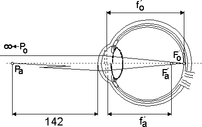 Na rysunku pokazano charakterystyczne parametry oka jako układu optycznego. Nad osią symetrii oka znajdują się parametry dotyczące oka nieakomodującego (oznaczone indeksem o), natomiast pod osią - akomodującego (oznaczenie indeksem a). Powierzchnie soczewki zaznaczone są liniami przerywanymi.