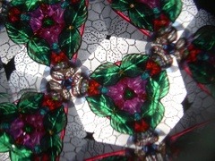 Jeśli chcesz zrozumieć jak działa kalejdoskop, spójrz na lampkę przez kalejdoskop, ale z "odwrotnej strony". Widać od razu, że lustra są tylko trzy. A kolorowe szkiełka umieszczone wewnątrz, między dwoma przesłonami, jedną matową a drugą przezroczystą, przypominają zielone liście, różowe płatki zaś czerwona igiełka przypomina łodygę.