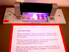 Widziałeś, jak sprawdzają banknoty w banku? Są one wkładane pod taką fioletową lampę -jeśli są prawdziwe, to świecą się na nich małe kolorowe wstążeczki i pasemka.