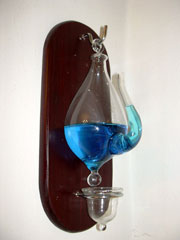Jak przewidzieć zmiany pogody? Niektórzy ludzie przewidują pogodę na podstawie "łamania w kościach". Ale nie wszyscy są meteopatami. Lepszym urządzeniem do przewidywania zmian pogody jest barometr. Widoczne na zdjęciu szklane naczynie służy do określania zmian ciśnienia atmosferycznego i nazywane jest barometrem Goethego. Przy dużym ciśnieniu atmosferycznym poziom cieczy widocznej w wąskim naczyniu obniża się, a przy małym ciśnieniu - podwyższy się.